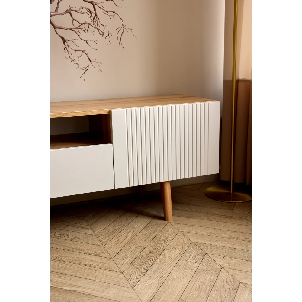 Тумба под ТВ этой модели имеет фасад из материала мдф. Это безопасный для здоровья и долговечный материал, который сохраняет свой внешний вид.