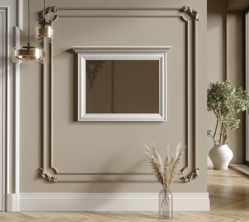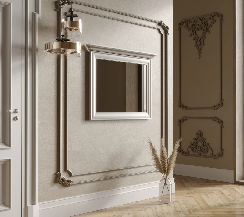 Верхнюю часть зеркала украшает карниз из декоративной МДФ планки, что подчеркивает классический стиль.