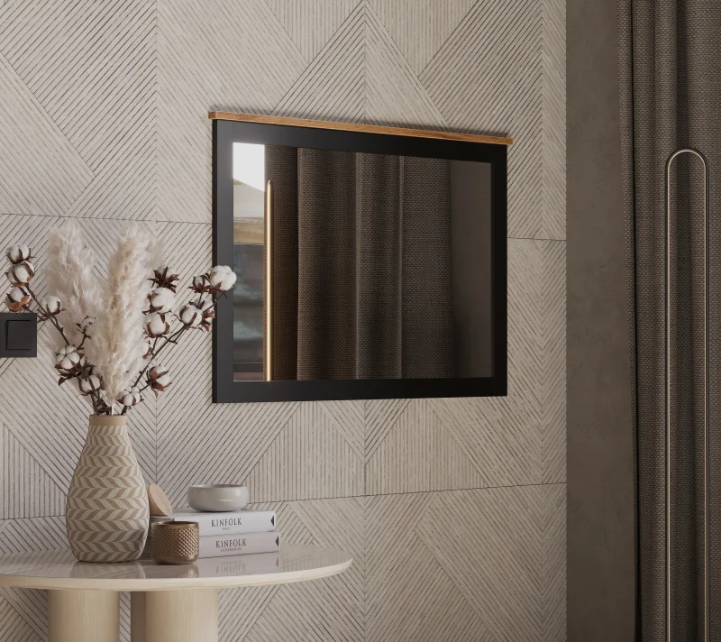 Зеркало обрамлено в черную раму, которая удачно контрастирует с фактурным карнизом. Такое сочетание придаст индивидуальности любой комнате.