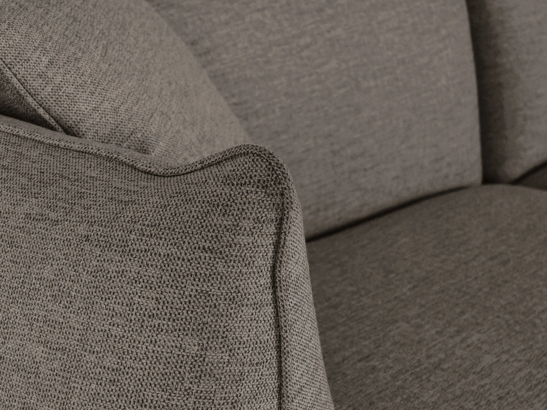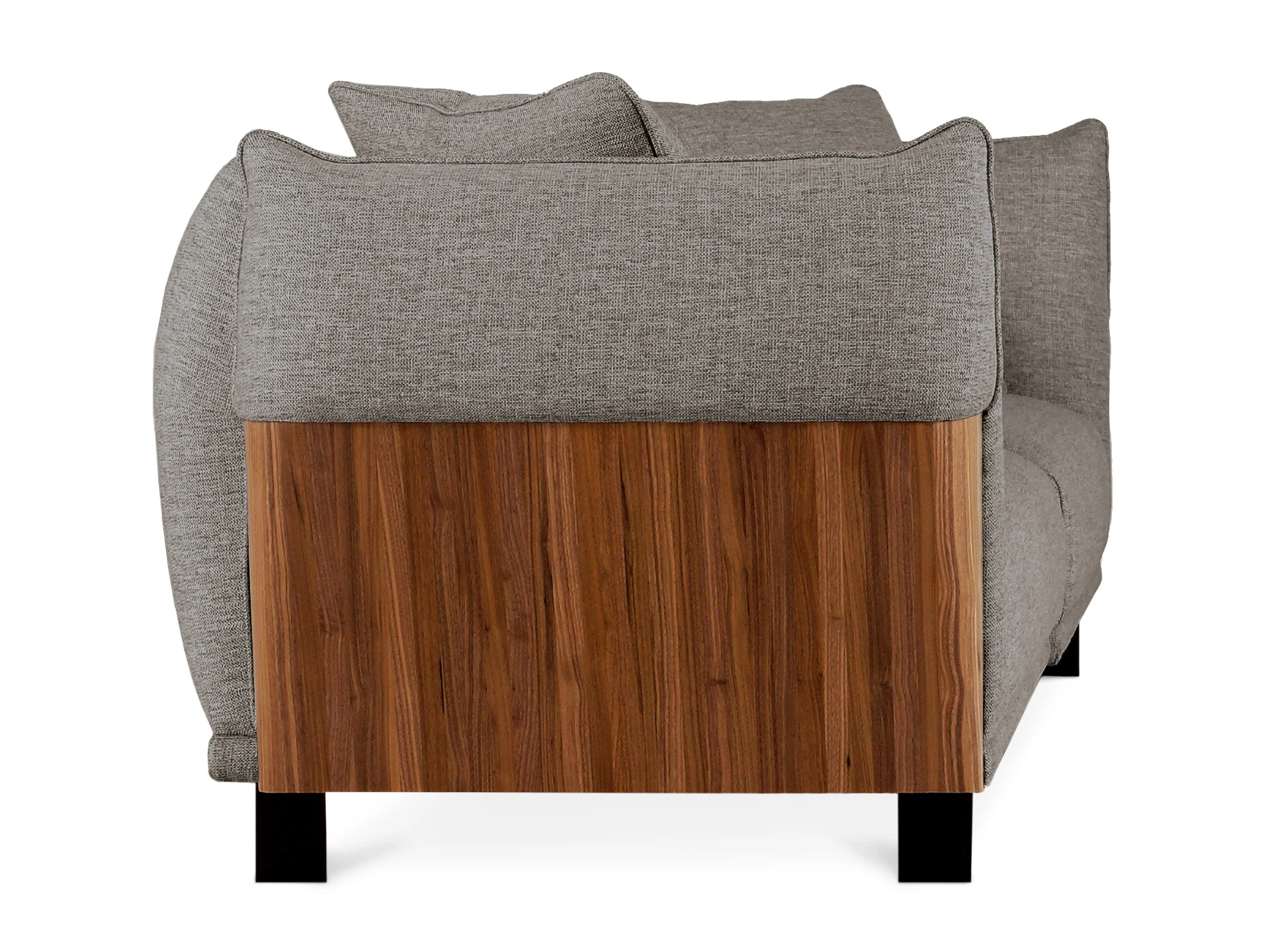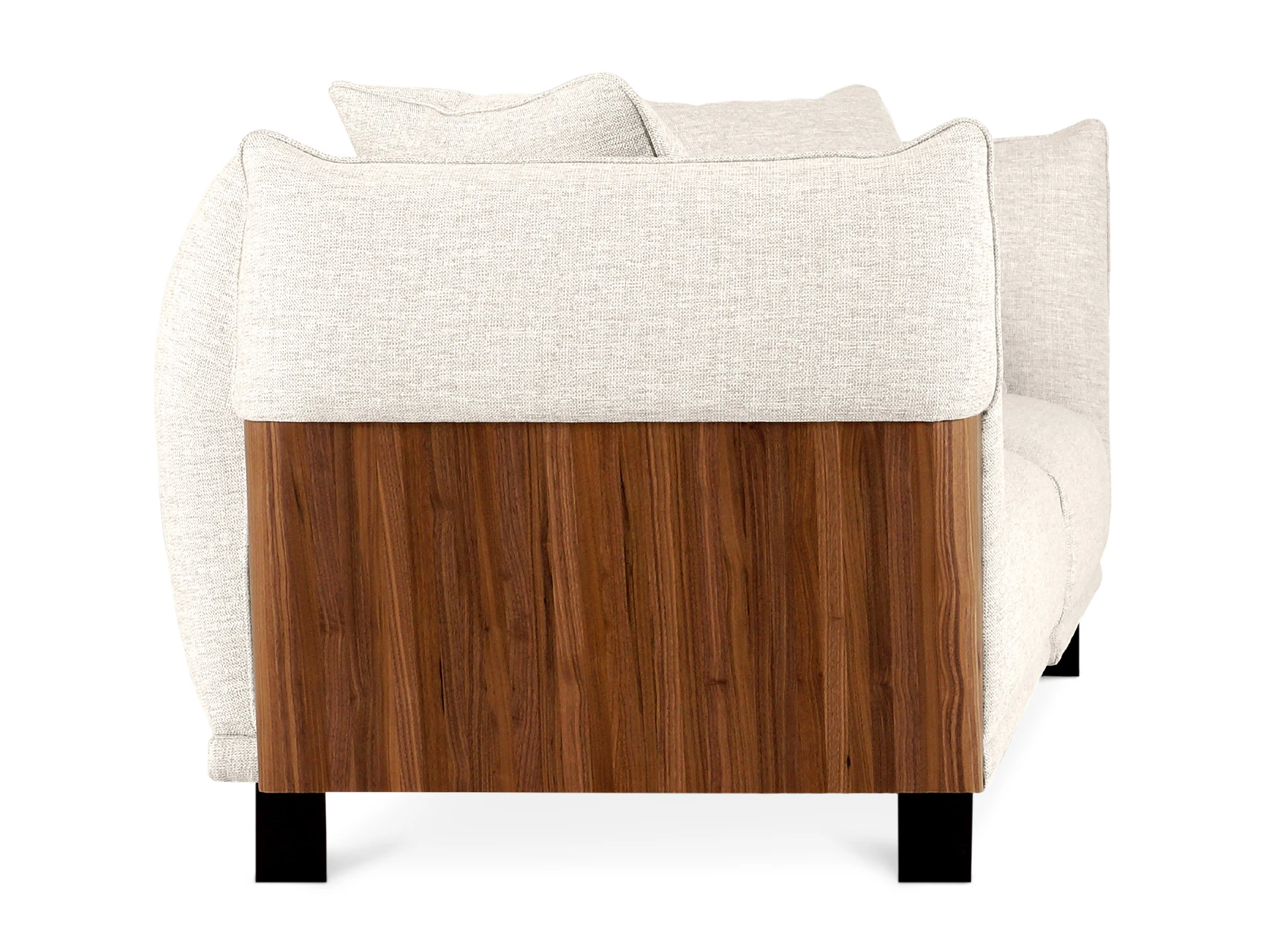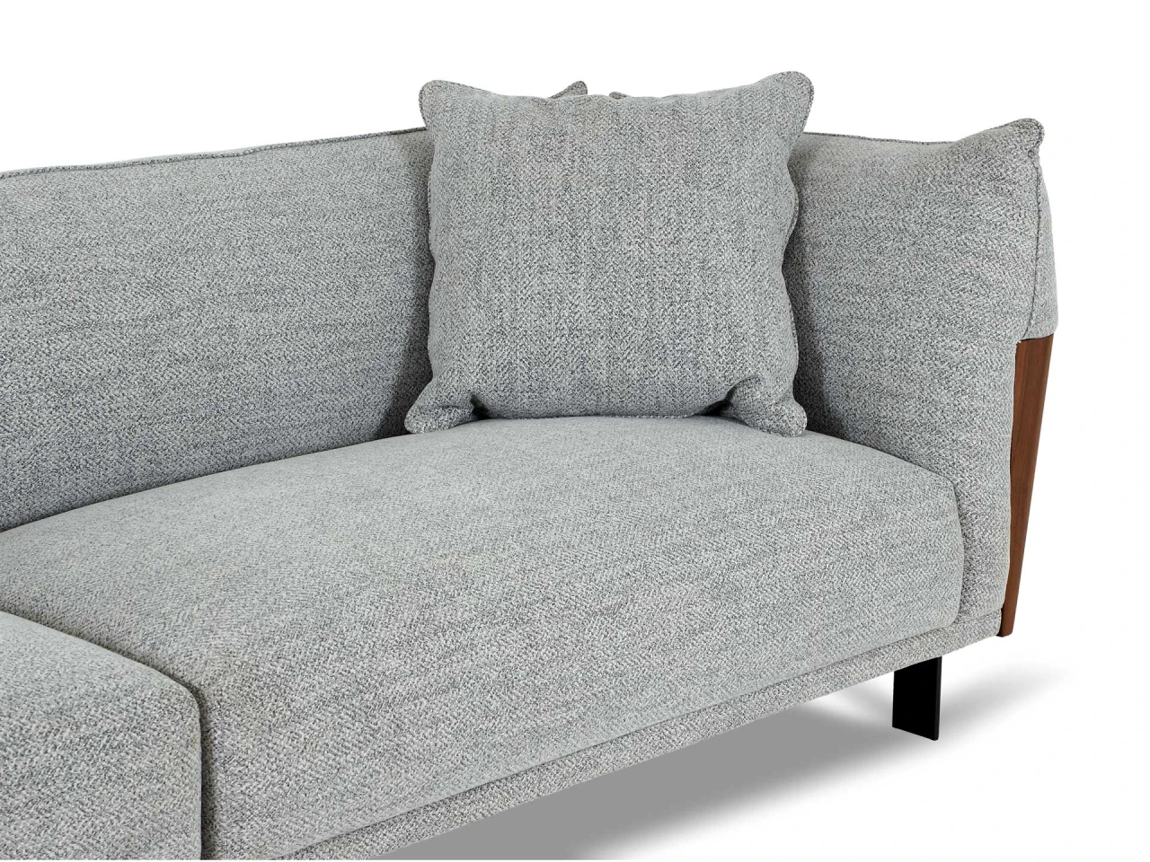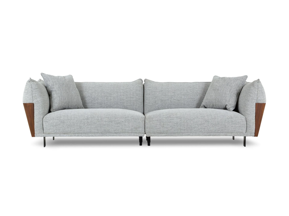 Материал обивки - рогожка, материал ножек - металл, материал подлокотников - МДФ в шпоне. Наполнитель подушек и сиденья - пух/перо. Лицевой чехол декоративных подушек - съемный, на молнии.