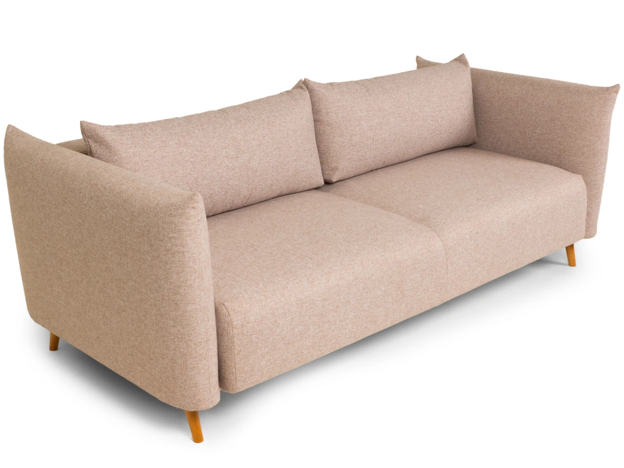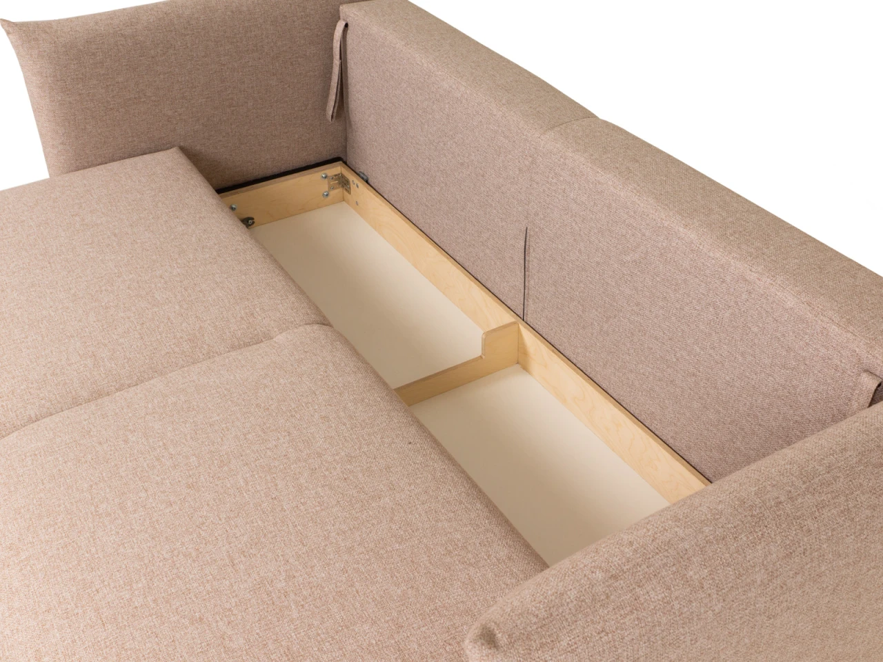 Диван Menfi превращается в кровать с помощью выдвижного механизма «еврокнижка» — прост и надежен в эксплуатации. Чтобы трансформировать диван нужно вытянуть секцию сиденья вперед, а на освободившееся место положить спинку дивана. Под сиденьем есть ниша, в которой можно хранить белье, текстиль, различные вещи.