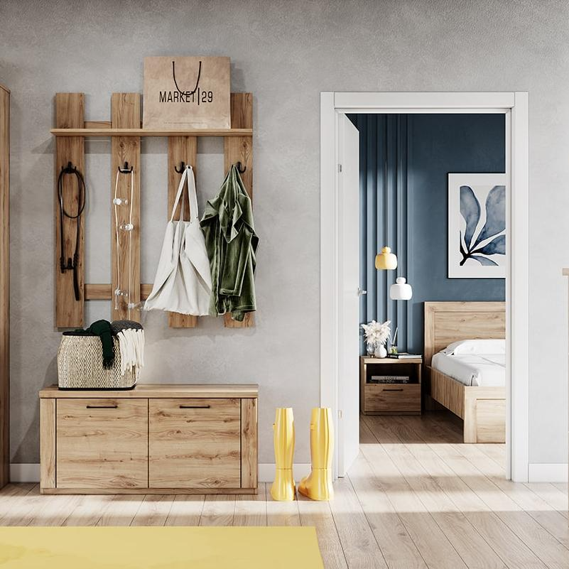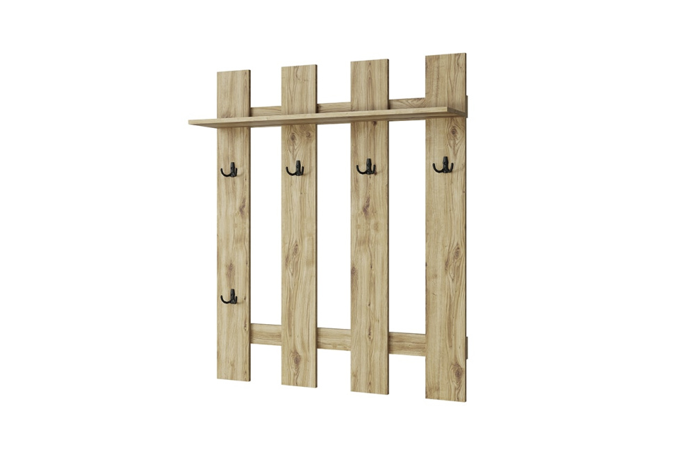 Простая вешалка в коричневом цвете дуба наварра Doorset 105 по дизайну подходит прихожим современного стиля. Ее неброский внешний вид прекрасно гармонирует с темной и светлой стеновой отделкой. На внешнем матовом покрытии не заметны потертости и шероховатости. ЛДСП прекрасно выдерживает контакты с мокрыми куртками и не деформируется при резком понижении температуры в помещении. Это универсальное решение для любых потребностей и задач.