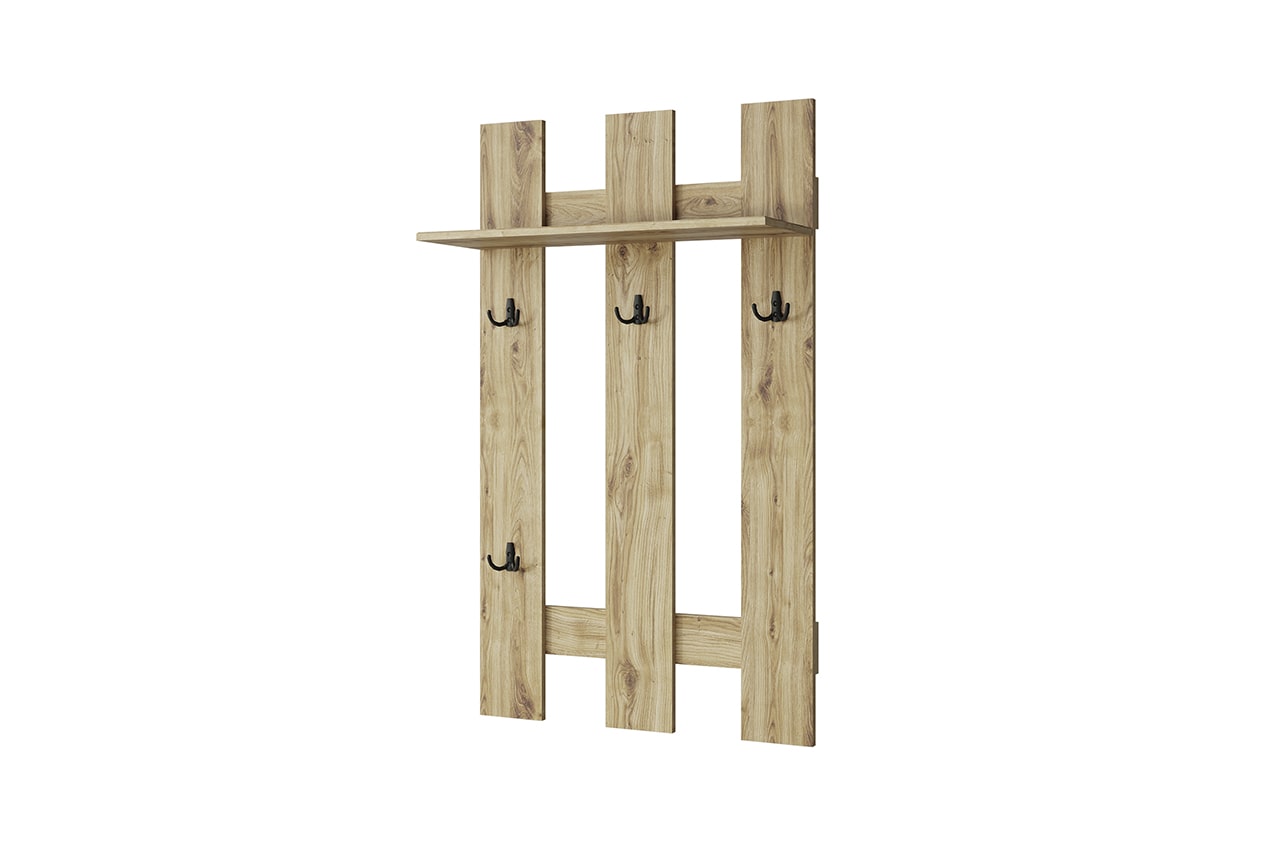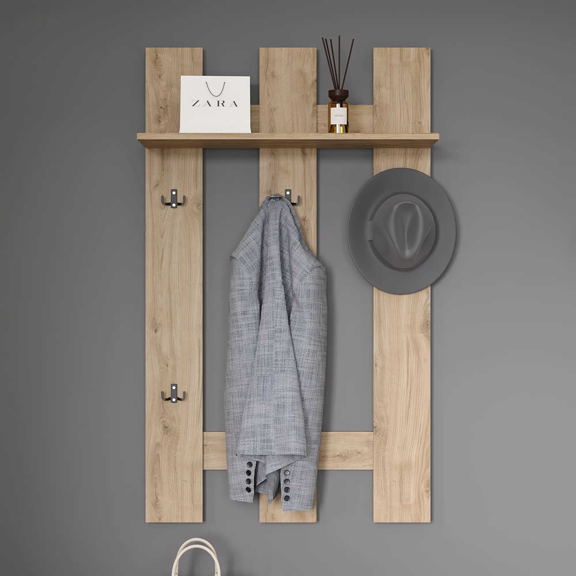 Простая вешалка в коричневом цвете дуба наварра Doorset 75 по дизайну подходит прихожим современного стиля. Ее неброский внешний вид прекрасно гармонирует с темной и светлой стеновой отделкой. На внешнем матовом покрытии не заметны потертости и шероховатости. ЛДСП прекрасно выдерживает контакты с мокрыми куртками и не деформируется при резком понижении температуры в помещении.