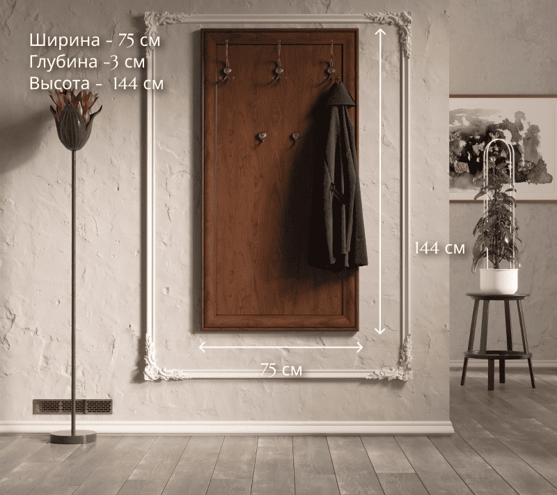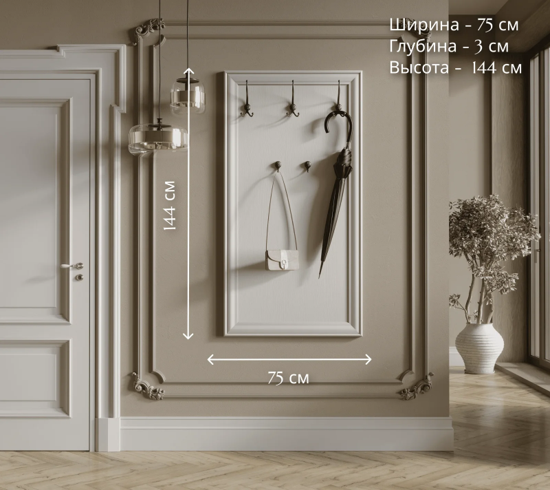 Вешалка представляет собой вертикальную панель с пятью надежными металлическими крючками. Компактный дизайн позволяет эффективно экономить пространство, что делает ее идеальным выбором для небольших помещений.