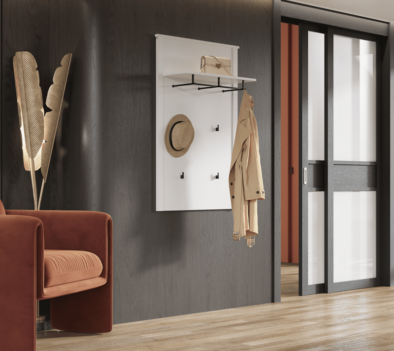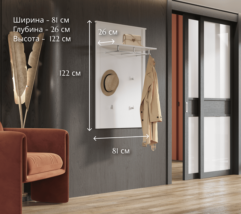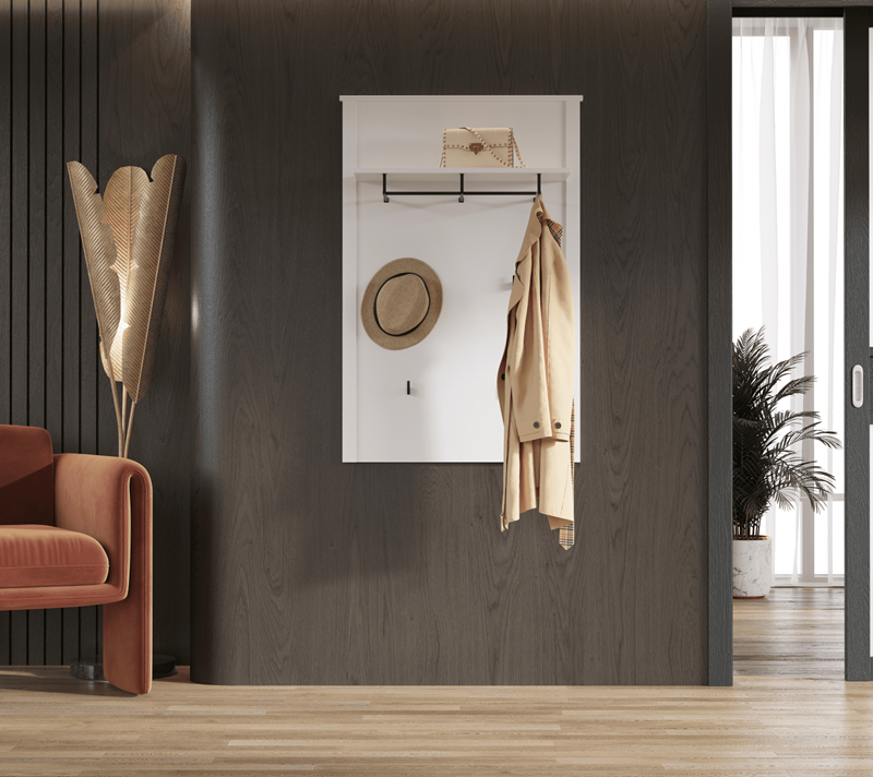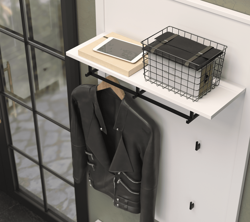 Вешалка состоит из горизонтального щита с крючками, которые идеально подходят для развешивания верхней одежды, сумок и аксессуаров. Верхняя полка предоставляет дополнительное место для хранения шляп, зонтиков, ключей или декоративных элементов. Под полкой располагается торцевая штанга удобная для хранения ремней, шарфиков или одежды на вешалках.