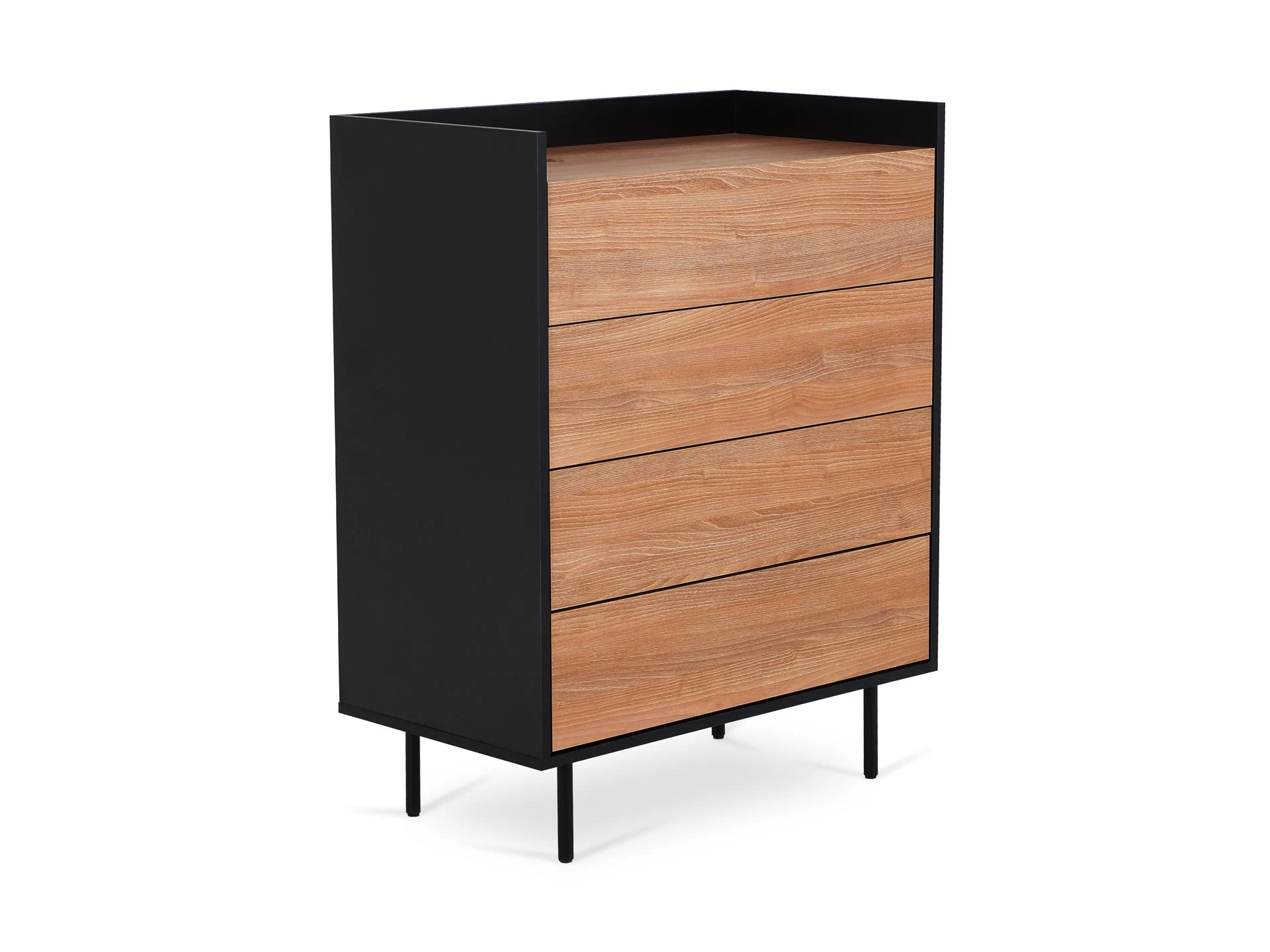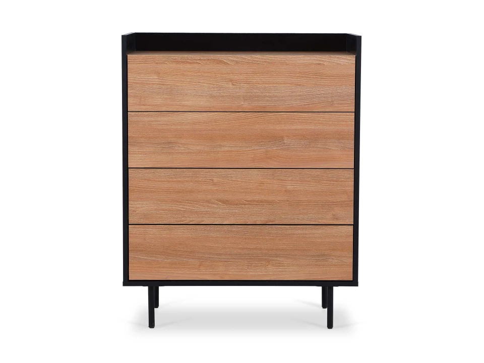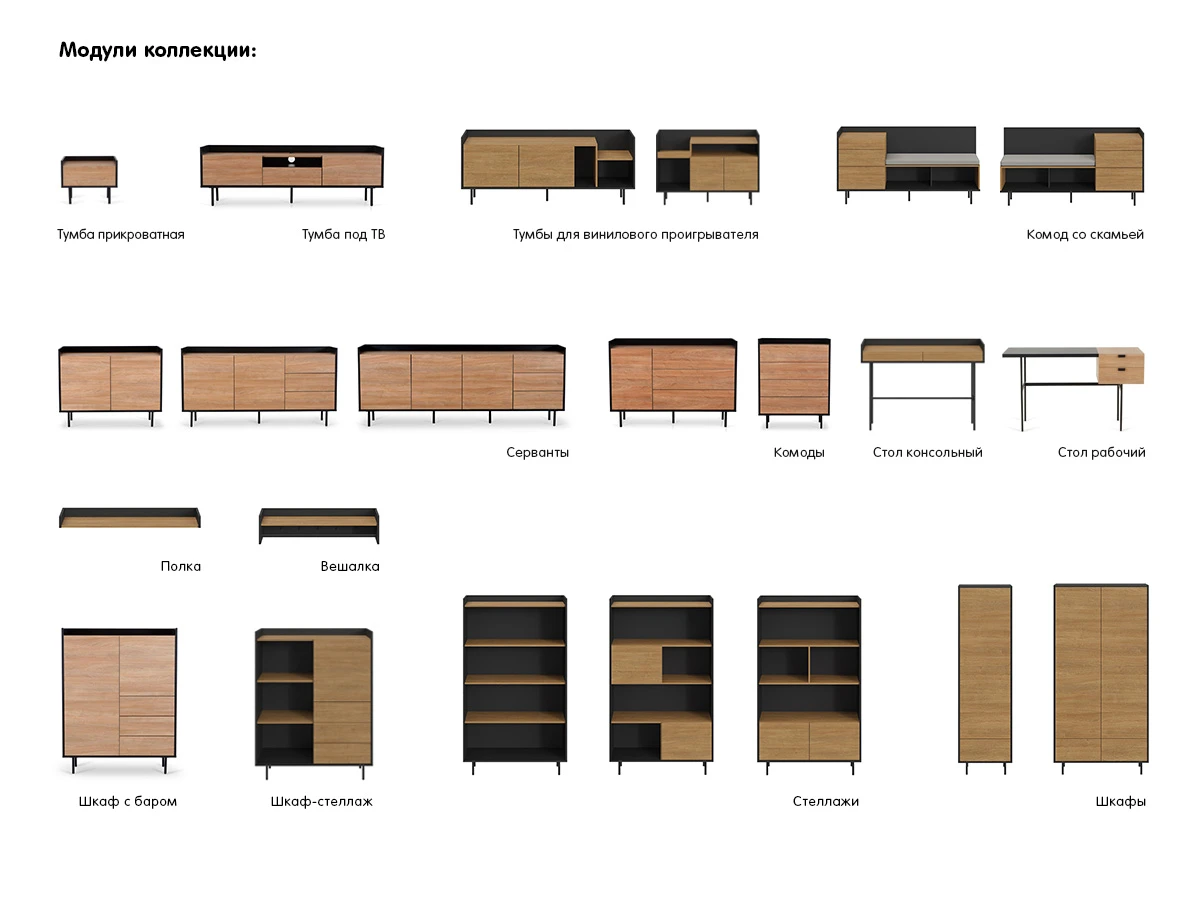 Особенность линейки заключается в контрасте элементов. Скругленные изящные металлические ножки поддерживают внушительное основание. При этом внешний вид моделей остается лёгким и элегантным. Также игру противоположностей усиливают древесная текстура на фасадах и черный цвет боковин с задней стенкой. Что придаёт большей динамики и выразительности дизайну. Эксклюзивность и завершенный вид воссоздает рамка, возвышающаяся над верхним горизонтом. Минималистичный вид конструкциям обеспечивает скрытая фурнитура. Двери и ящики открываются плавно, без шума и усилий. Комбинируйте комоды и серванты Look для создания целостного образа интерьера.